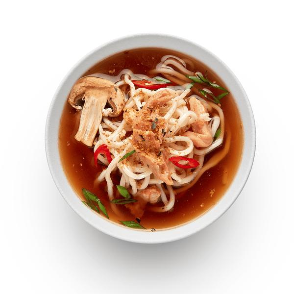 Состав: Курица су-вид, шампиньоны, лук зеленый, перец чили, фурикаке, удон