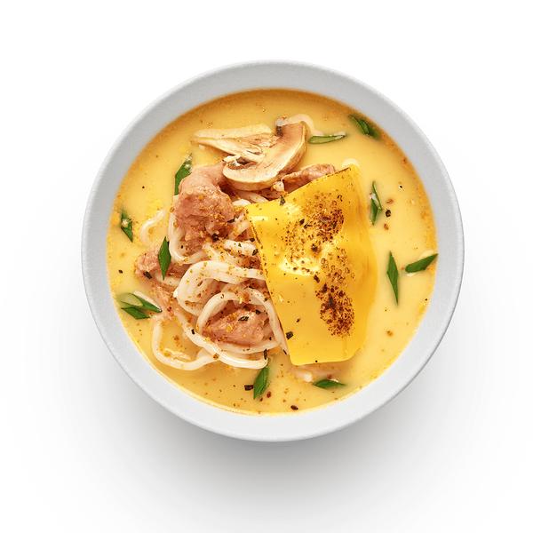 Состав: Сыр плавленый, пюре имбирное, курица су-вид, шампиньоны, курица, удон, лук зеленый, фурикаке