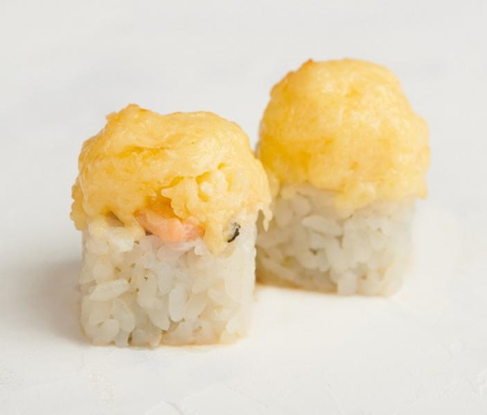 Состав: Запечённый ролл. Сыр сremette, креветки, сыр, майонез.