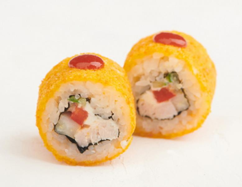Состав: Ролл с курицей холодного копчения, сливочным сыром, огурцом, болгарским перцем и пекинской капустой, обжарен в темпуре и сухарях. Подаётся под соусом ким-чи.