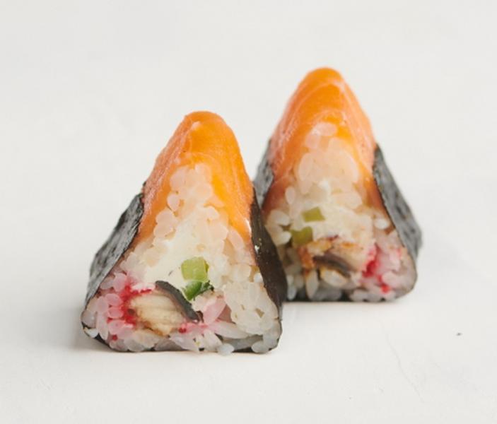 Состав: Лосось, угорь, сыр сremette, огурец, икра тобико, зелёный лук.