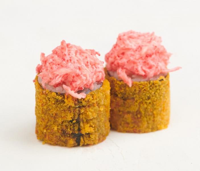 Состав: Копчёная курица, сыр сremette, лист салата, в темпуре и сухарях, майонез, сыр, икра тобико.