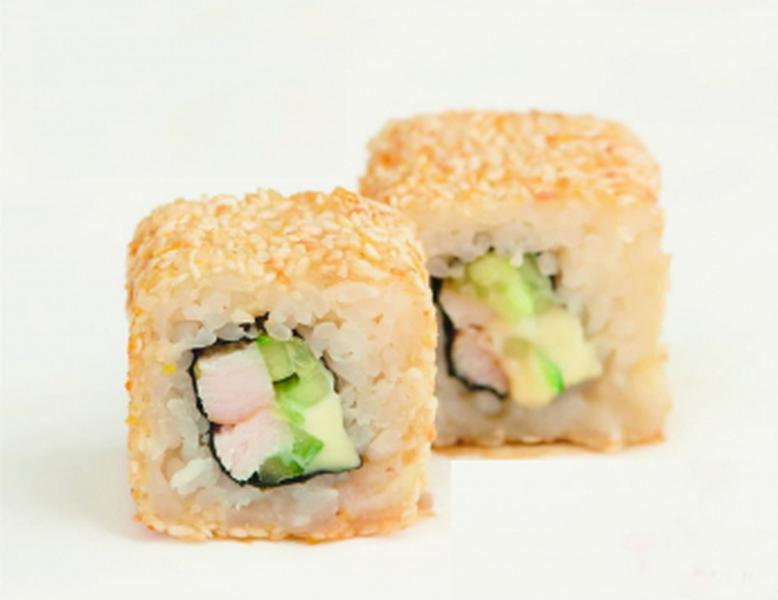 Состав: Ролл с копчёной курицей, сливочным сыром и огурцом, обжарен в темпуре, украшен кунжутом.