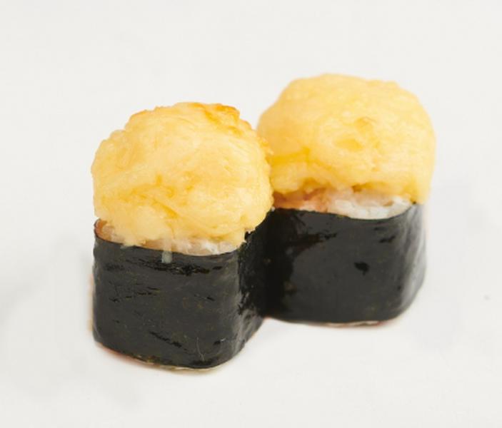 Состав: Запечённый ролл. Копчёная курица, маринованные грибы, сыр, зелёный лук, майонез.