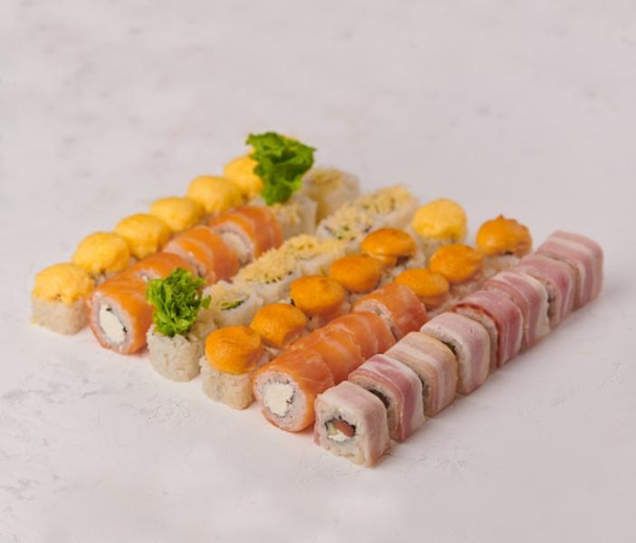 Состав: Филадельфия, Батакон кунсей с сёмгой и беконом, Цезарь маки с курицей, Эби мусияку с креветками, Спайси ягай маки с мидиями *товар на фото может отличаться от оригинала