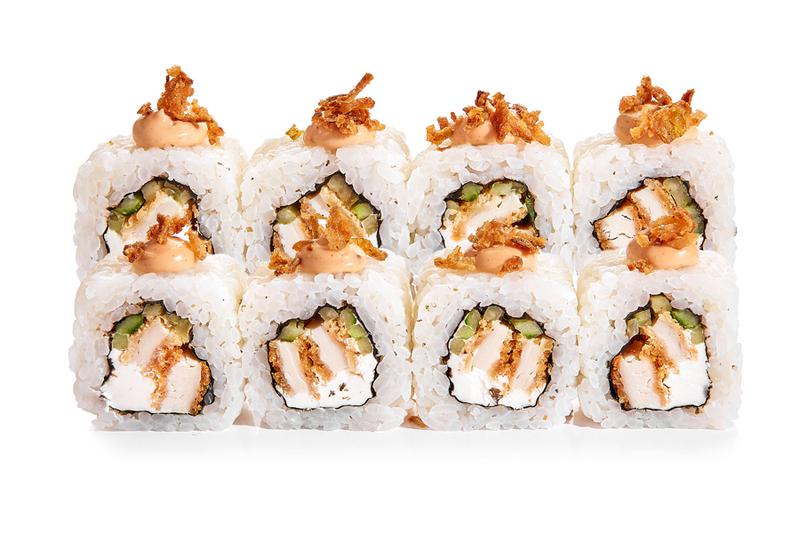Состав: Рис, нори, сыр сливочный, огурец, курица в панировке, соус цезарь, лук фри