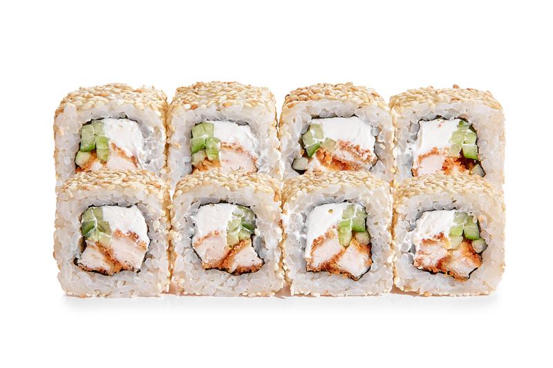 Состав: Рис, нори, сыр сливочный, курица в панировке, огурец, кунжут белый