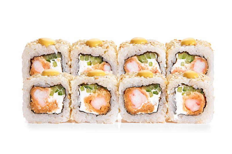 Состав: Сыр, нори, огурец, креветка в панировке, сыр сливочный, кунжут белый, соус манго