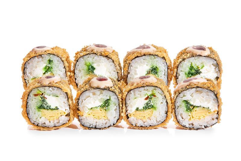 Состав: Рис, нори, омлет, чука, кляр темпурный, соус унаги, соус ореховый, сыр креметте.